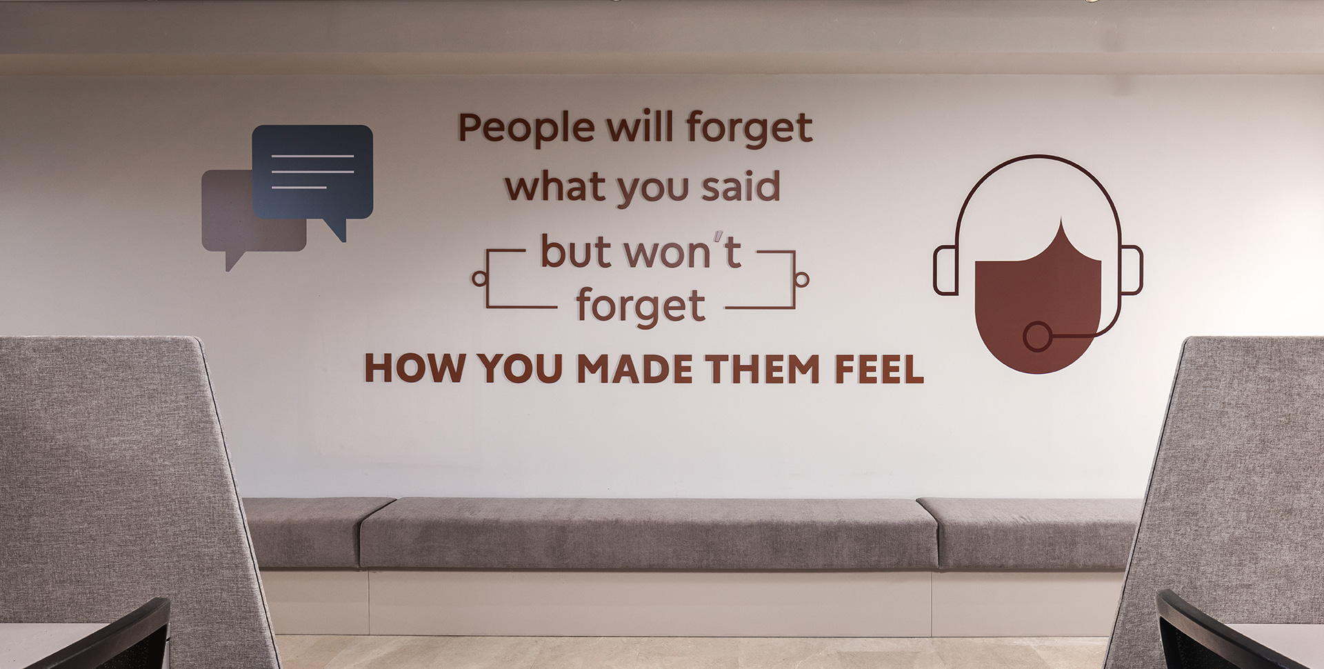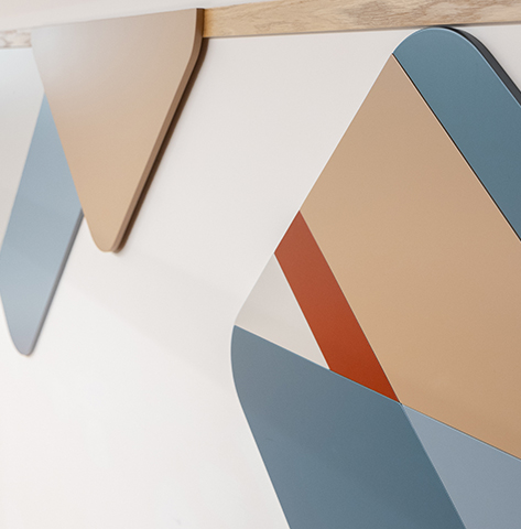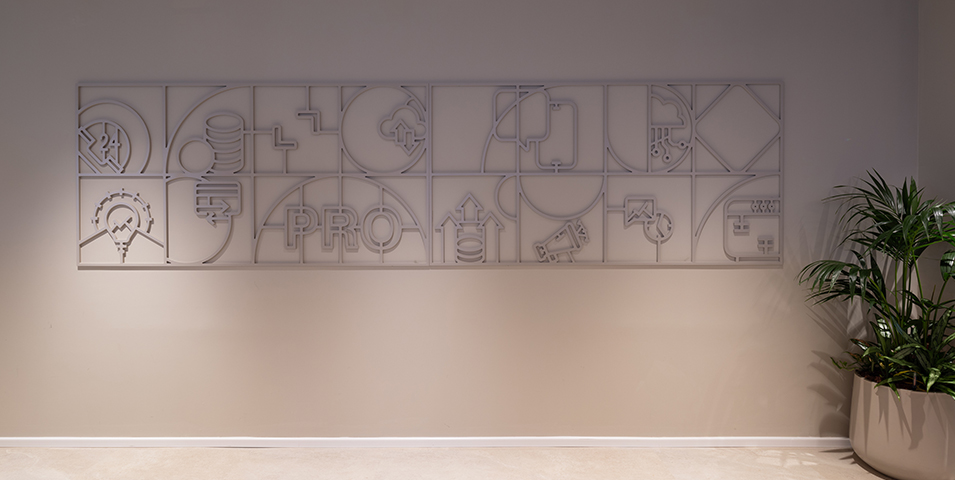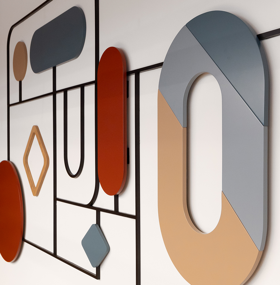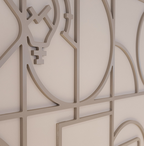 which incorporates allusions from the bank's branding language and these were imprinted on 3D elements made of sculpted and painted MDF.